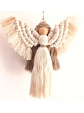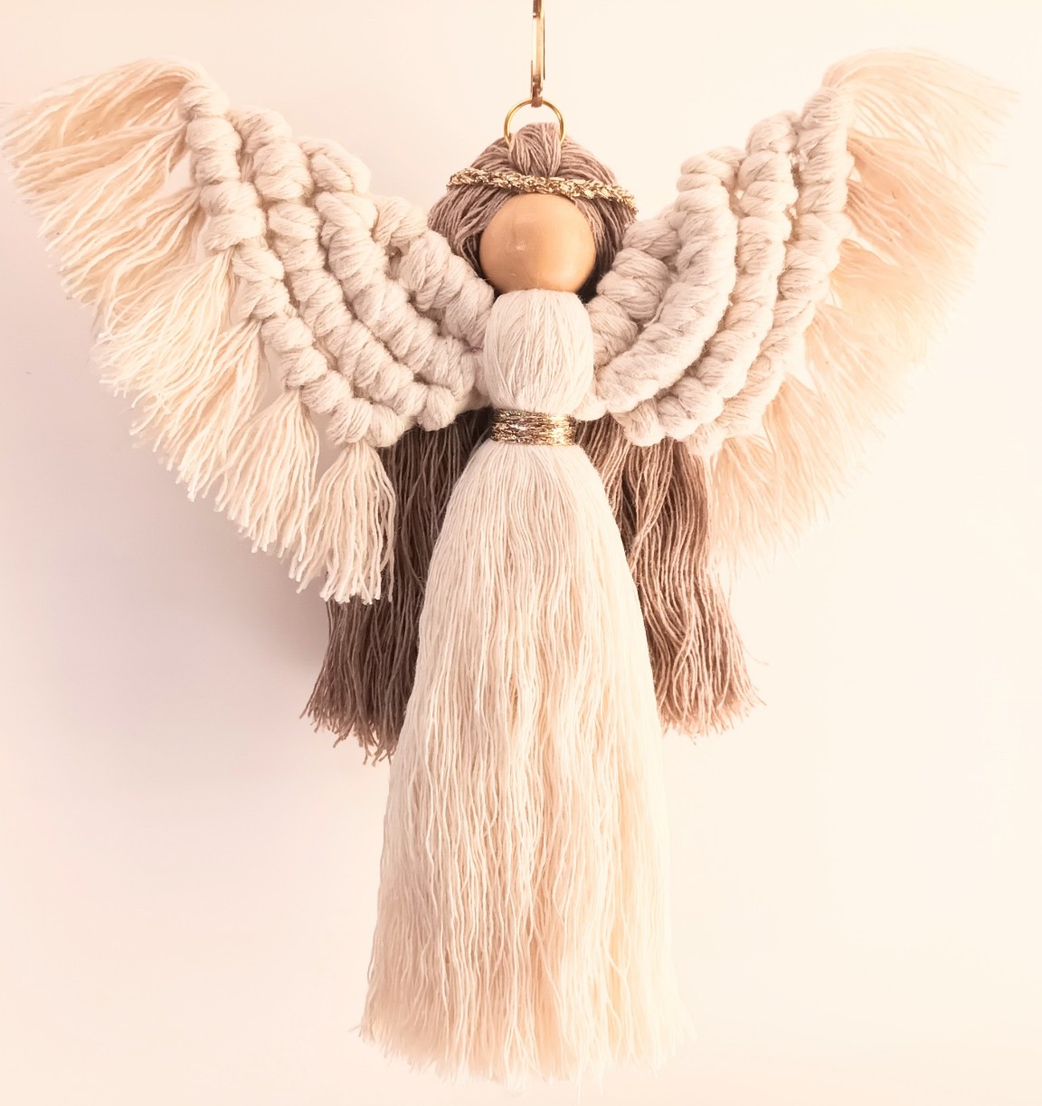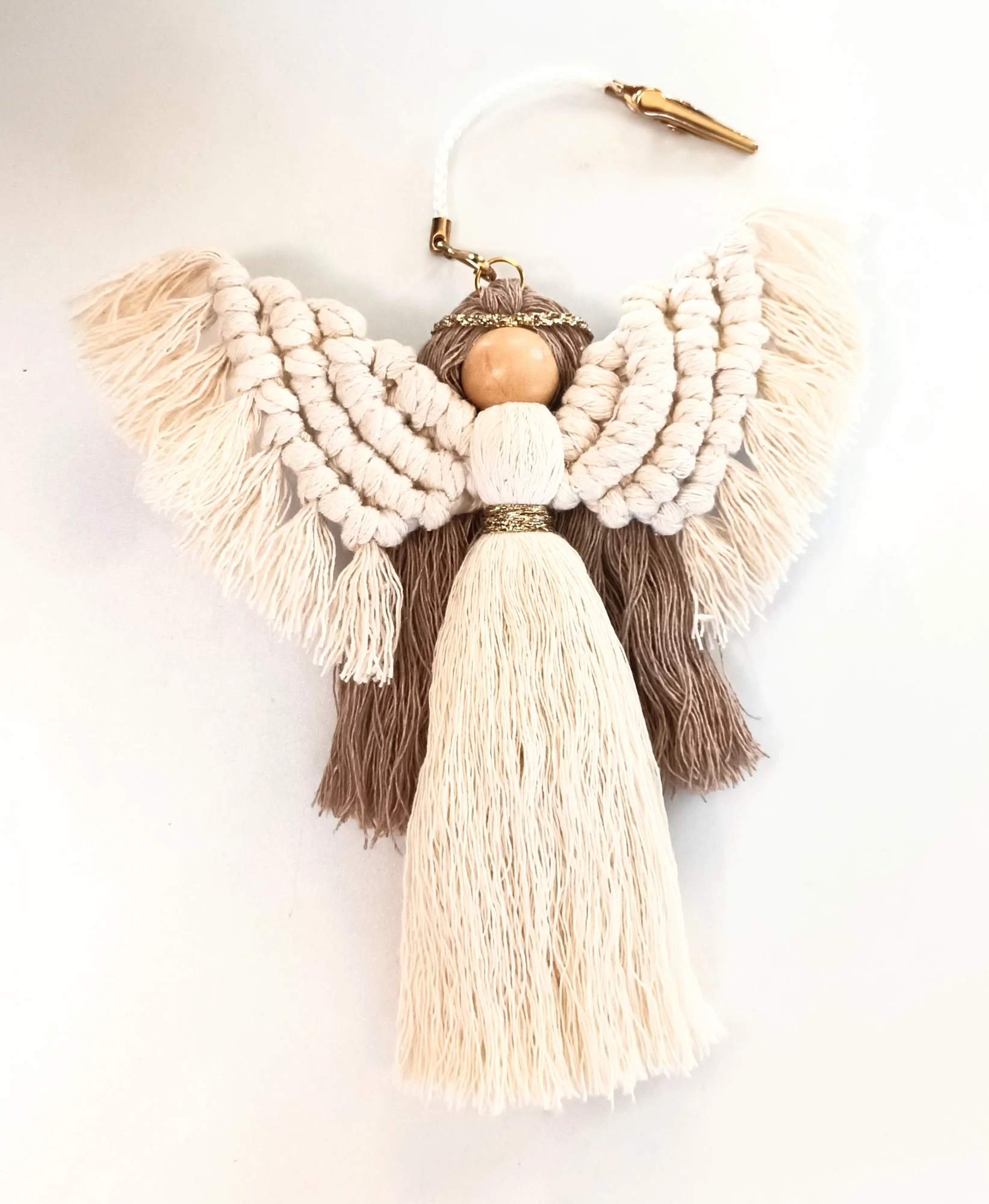 Handmade Macrame Angel decoration, cream colour. Approximately 152mm high (6 in.) without the clip, 279mm High (11in) with the clip and 152mm wide (6in.). Comes with clip, ready to hang from curtain or Christmas tree. Made of macrame cord, wooden bead and clip. Perfect as a gift for people you love or for yourself. Can be used to decorate for Christmas or simply add to your decor. Please note, colours may differ slightly.
